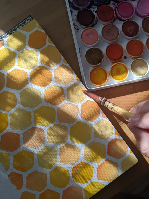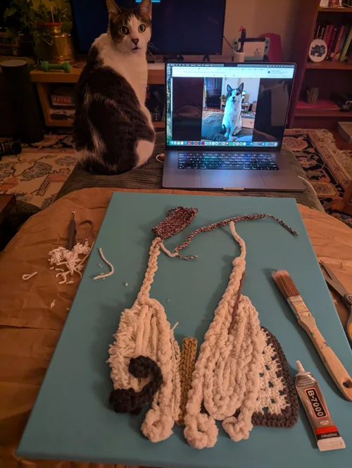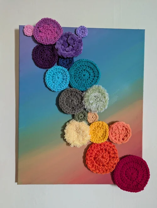 “paintings” made from yarn, glue, and acrylic paints on canvas.